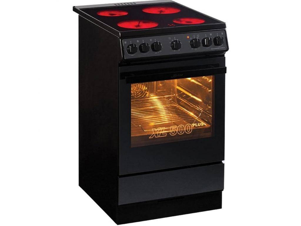 Компактная электроплита 0,5 метра в ширину с электрическим духовым шкафом. Имеет термостат, режим гриля, подсветку. Варочная панель также оснащена индикаторами остаточного тепла. В остальном функционал традиционный: управляется поворотными переключателями, чистка происходит вручную.