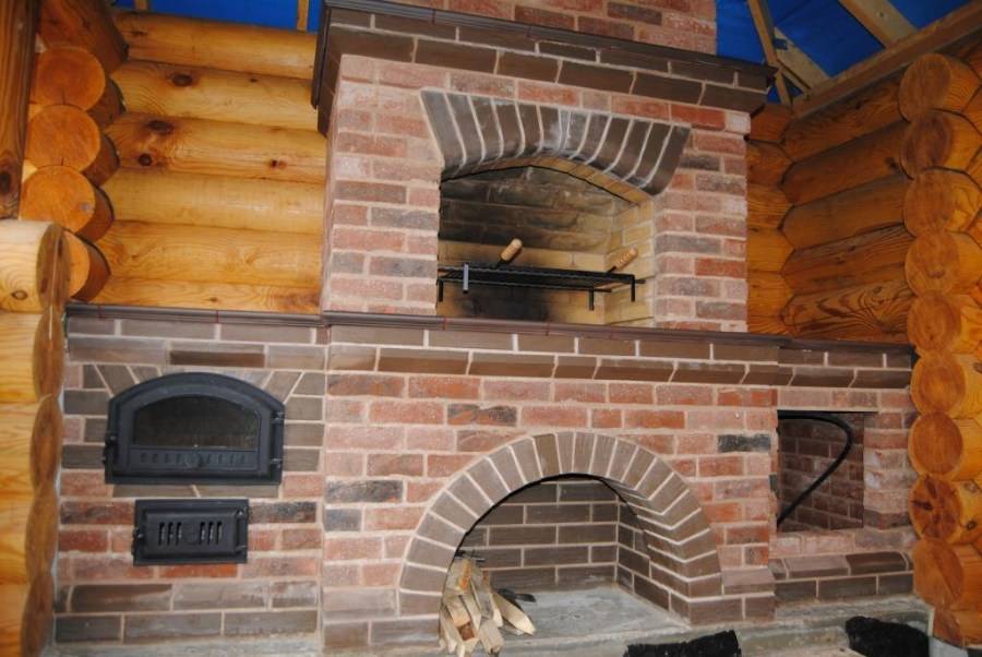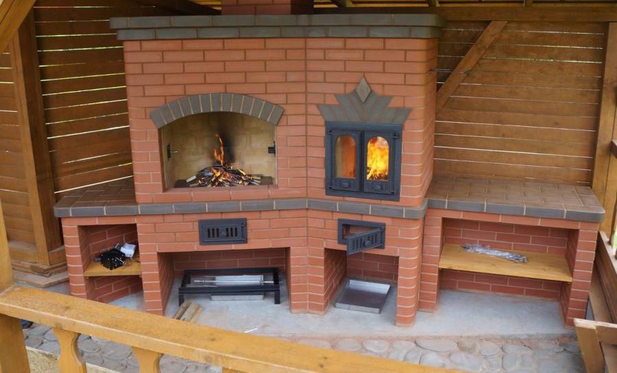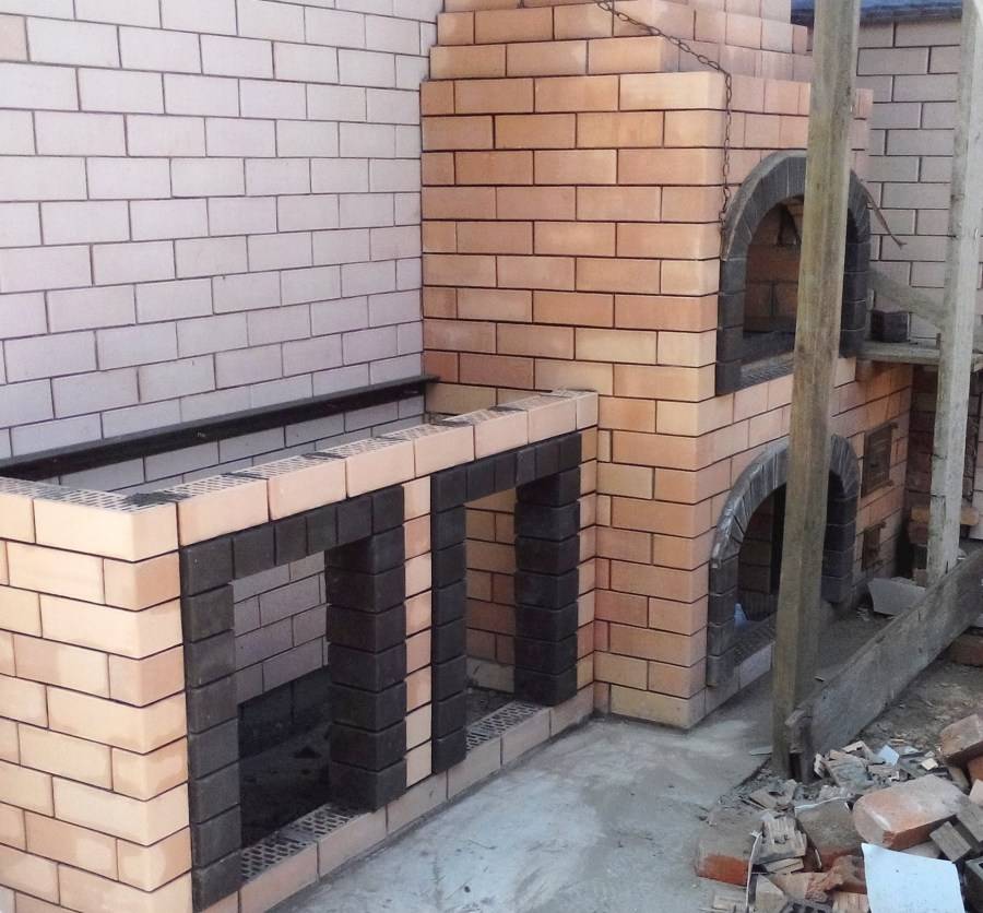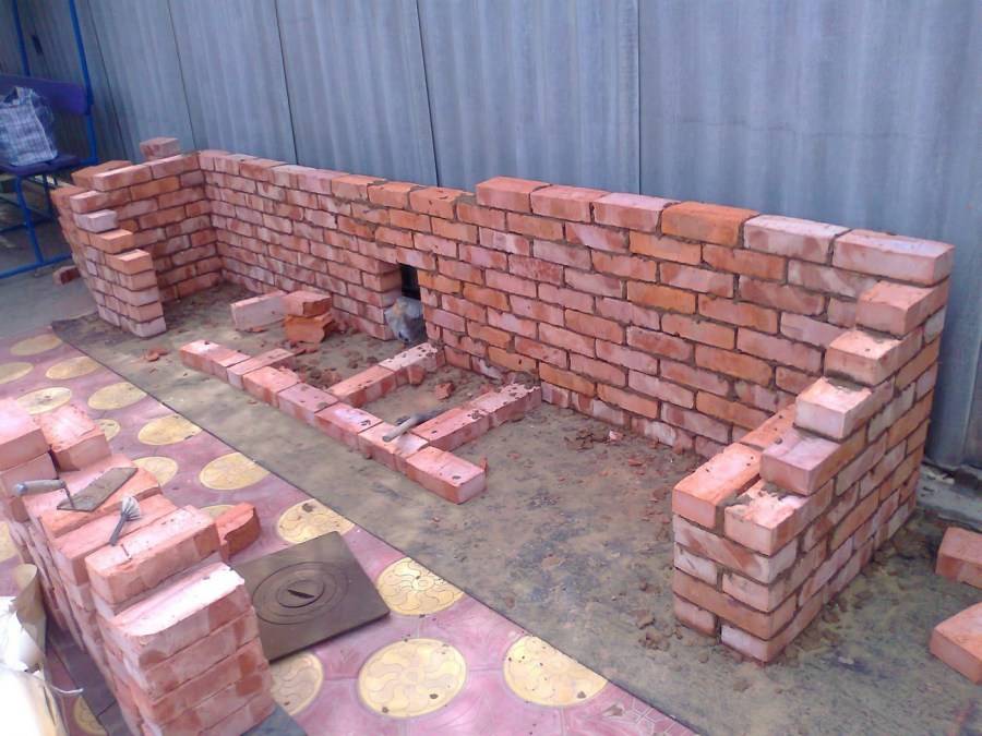 На печи сверху чугунная конфорка для казана или сковороды. Труба – оцинкованная труба для водостокаПечь – из огнеупорного кирпичаМангальная зона – из обычного кирпичаВсе клалось на шамотной глине с пескомПол бетонРазмер по обвязке — 1200х1800