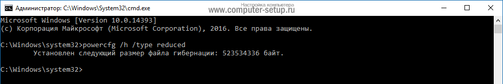 Первый способ уменьшения – командная строка. Прописываем в ней команду powercfg /h /type reduced и нажимаем Enter. Возвращение исходного размера производится командой powercfg /h /type full.