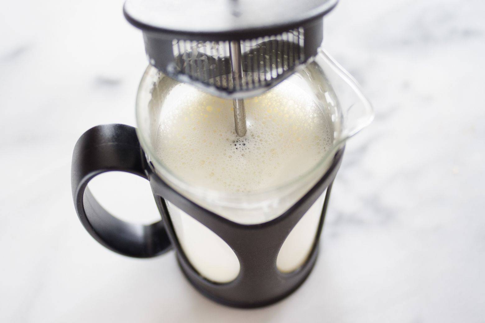 Колбу френч-пресса заполните на треть теплым (70°) молоком, опустите поршень и энергично выполняйте движения вверх-вниз секунд 40. Объем жидкости увеличится очень быстро, пенка получится красивой, с мелкими пузырьками. Выкладывайте ее на кофе, пока не остыла.