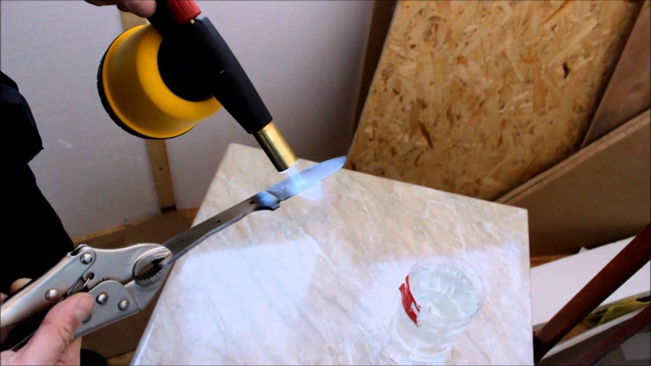 - чтобы середина лезвия была максимально упругой, можно вначале прогреть ее металлическим прутком, затем на пару часов погрузить нож в кипяток, далее – в ледяную воду.