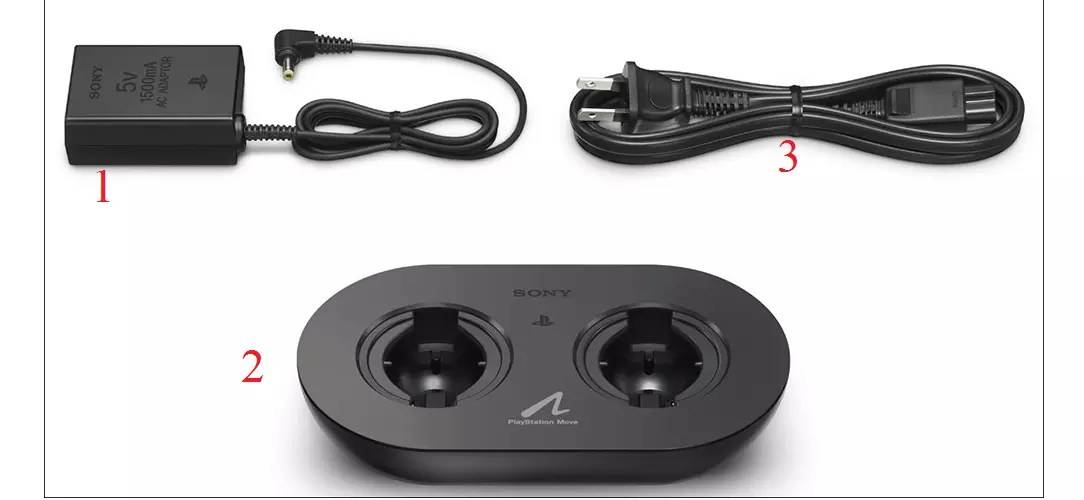 с помощью соответствующего кабеля. На рисунке 5 можно видеть фирменное устройство от Sony. Запчасть, обозначенная цифрой 1, подключается к запчасти 2. Кабель под номером 3 подключается к запчасти 1 и включается в розетку. Все предельно просто!