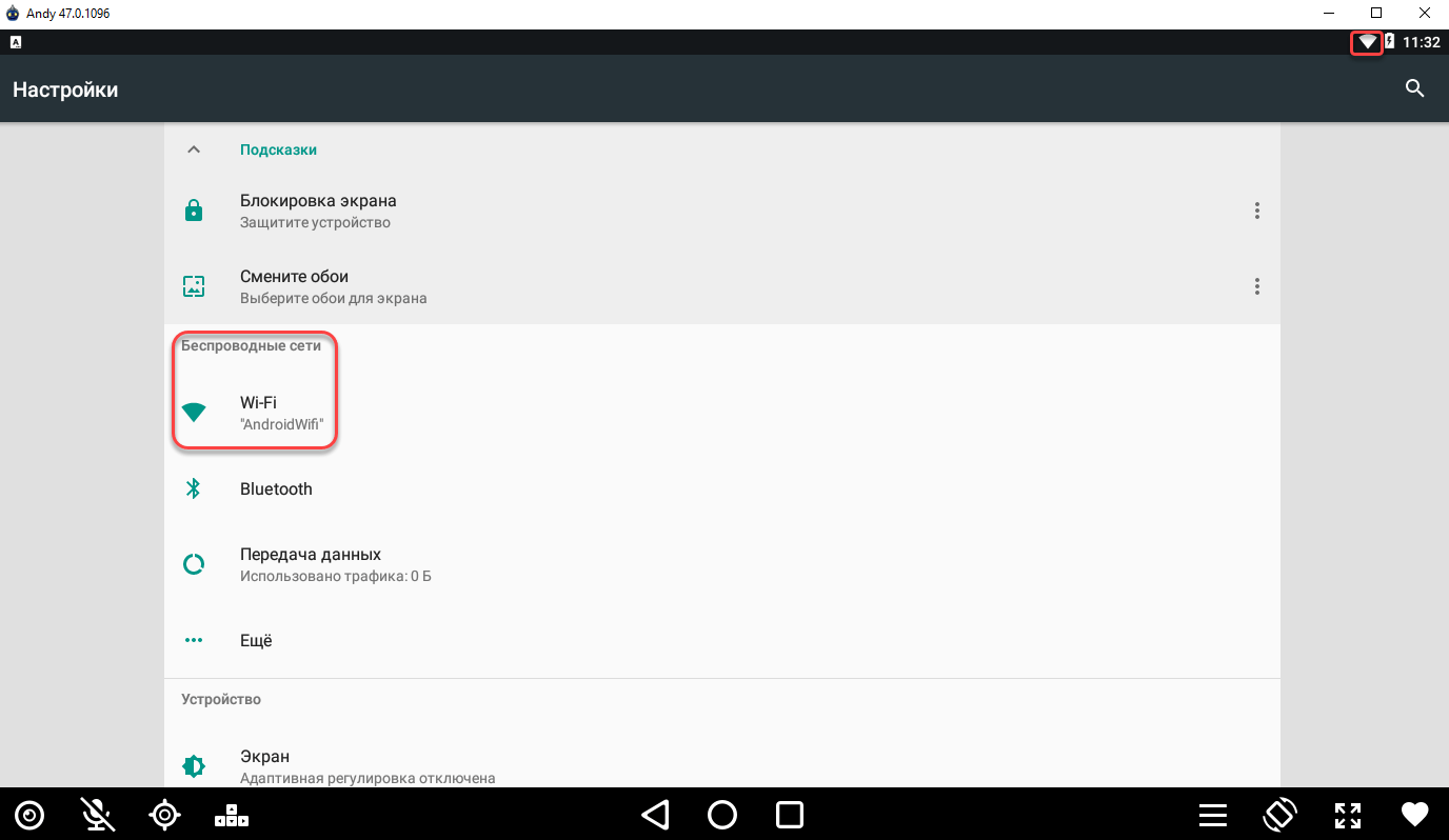 После установки в эмуляторе может отсутствовать подключение к интернету. В таком случае нажимаем символ Wi-Fi. Затем щёлкаем пункт «Беспроводные сети».