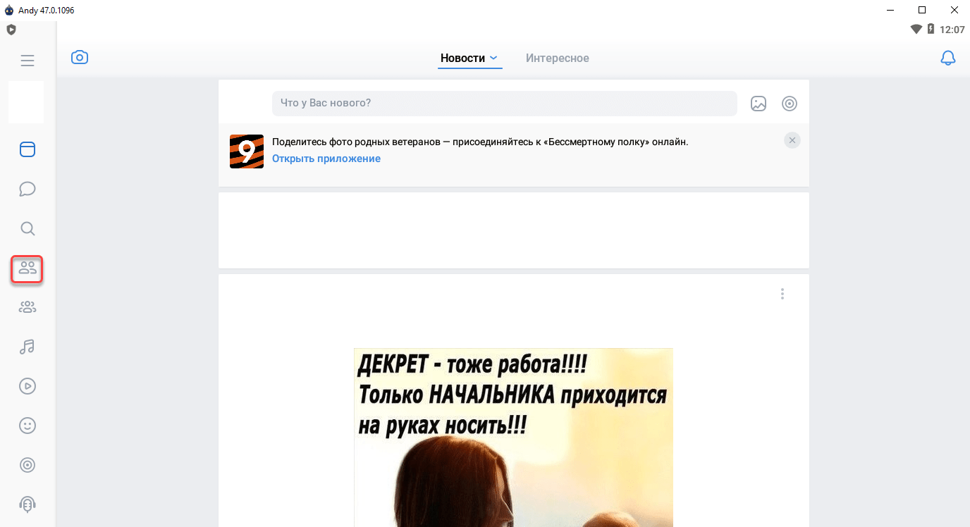 Дальше действуем по описанной выше схеме: заходим в Google Play, скачиваем мобильный вариант ВК. Есть только одно отличие в интерфейсе ВКонтакте: меню выбора друзей находится слева.