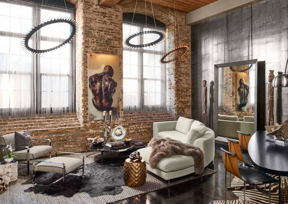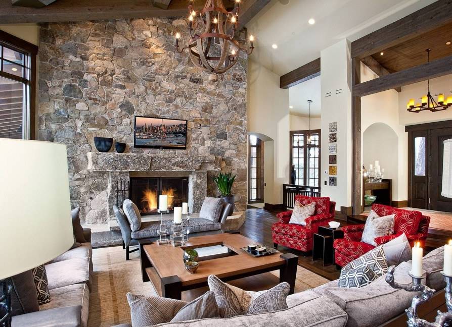 Если высота потолков в комнате воистину королевская, можно смело устанавливать групповую композицию из подвесных вычурных светильников. Они создадут нужный уровень освещения, а также зрительно «стянут» гостиную, добавив ей уюта.