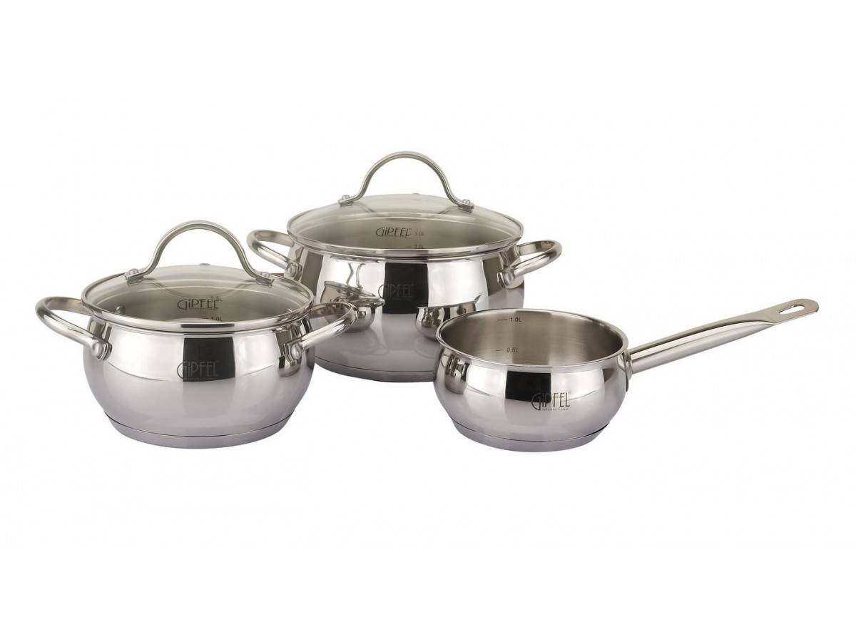 - Фирма Gipfel. Известный на российском рынке немецкий бренд. Специальная линейка для плит предлагает целые наборы посуды из кастрюль, сковородок, сотейников и ковшей различных по размеру.