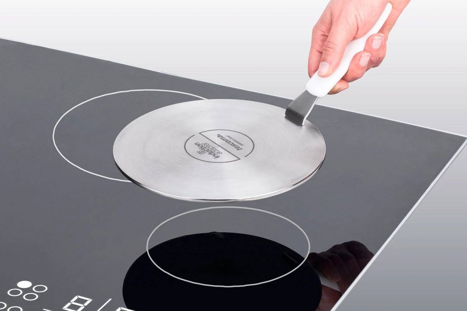 Для тех, кто приобрел индукционную панель, но не позаботился о посуде, производители предлагают специальные магнитные адаптеры. Они представляют собой тонкий магнитный диск с ручкой. Его размещают на конфорке плиты, а на него уже имеющуюся посудину.
