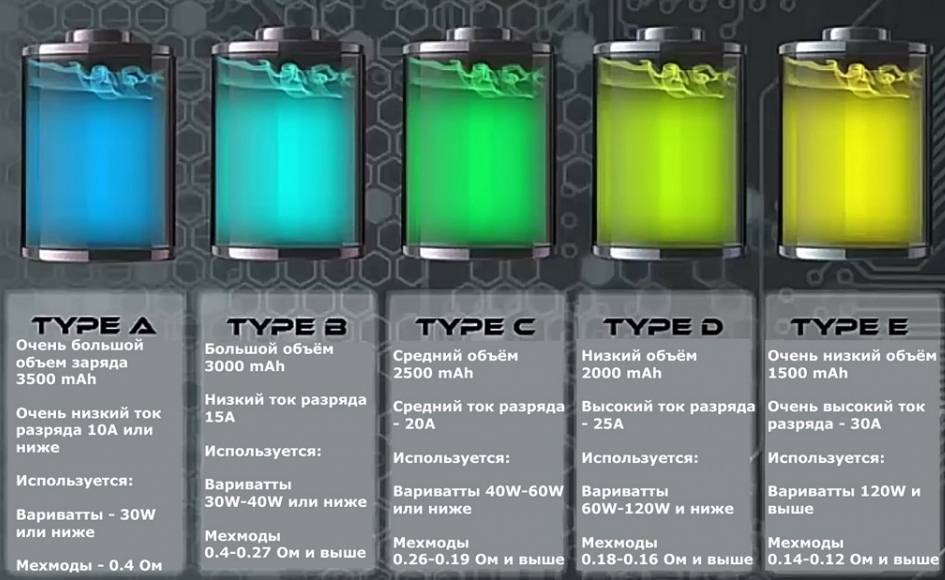- Тип Е. Модели этой категории характеризуются наименьшим объемом – всего 1500 мАч, но при этом величина подачи номинального тока здесь самая высока – целых 30А. Мехмоды – 0,14-0,12 Ом и выше.