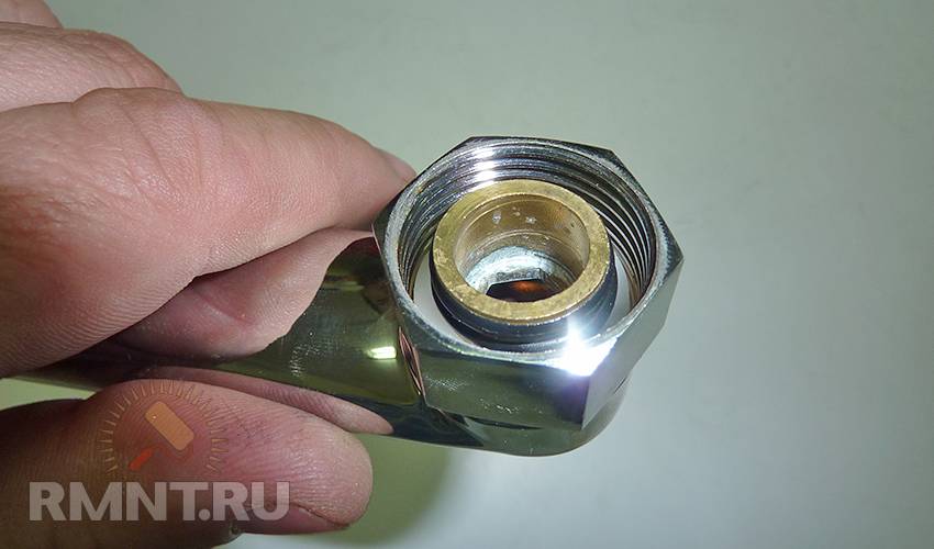 Следующей снимается вторая декоративная насадка. Она выполняет роль крышки и установлена поверх корпуса. Установлена она при помощи кольцевой гайки, которая в нормальном состоянии легко откручивается. Предположим, что гайка заржавела и открутить её не получается. Тогда резьба попросту срывается трубным краном или руками. Она не имеет никакого конструктивного назначения и выполняет, исключительно, декоративную функцию;