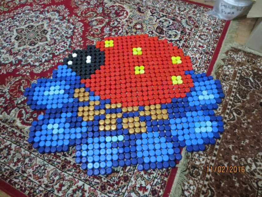 Как правило, коврик из крышек от пластиковых бутылок может также выполняться в определенной форме и с содержанием какого-либо рисунка.
