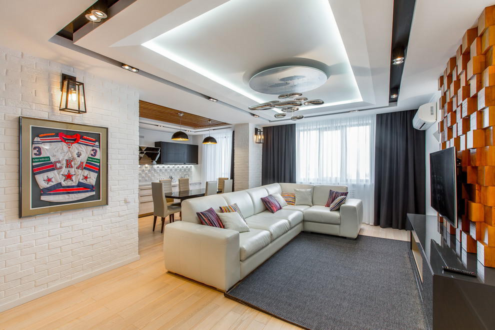 - Цвет и конструкция навесного потолка в зале зависит от габаритов помещения.
