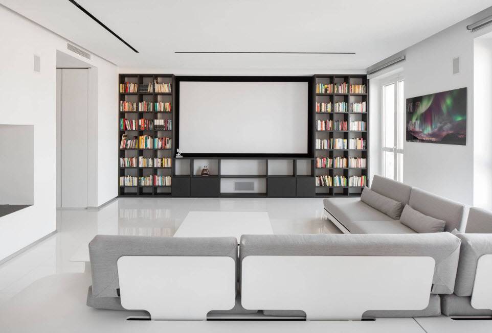 Главное помещение для отдыха в квартире должно иметь максимум открытого пространства. Создать такой интерьер помогут светлые цвета. Вещи лучше всего спрятать в ящики и шкафы. Если у вас есть возможность сделать гардеробную, это будет идеальным вариантом для решения проблемы хранения.