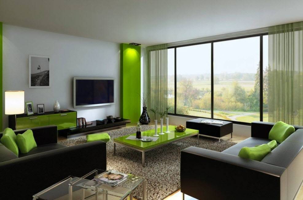 Сине-зеленые акцентные детали, оттеняемые светлыми пастельными тонами, привнесут в комнату свежесть и простор. Акценты яркого красного или же зеленого придадут уют и оживленность гостиной.