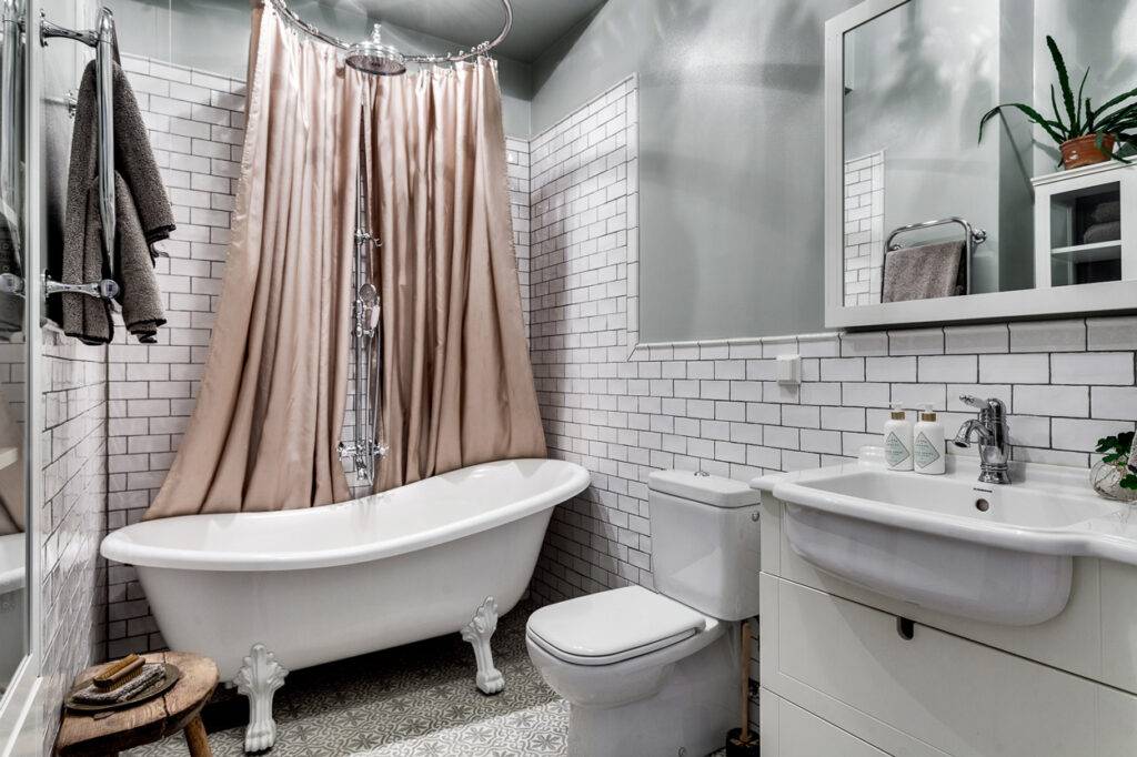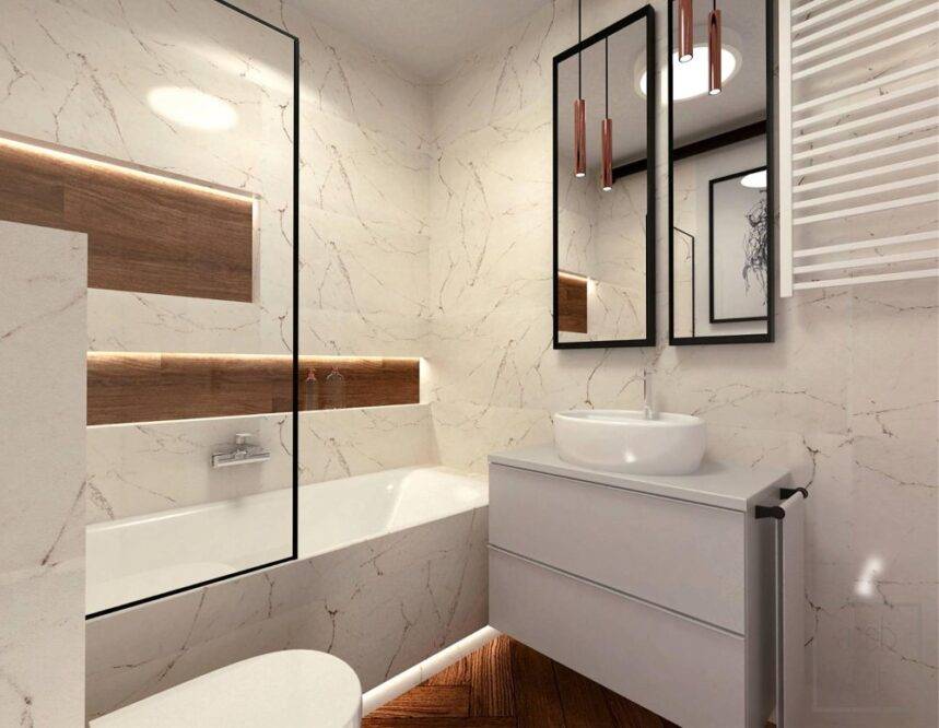 Современная ванна с душем очень часто имеет прозрачную дверь душа, поэтому он не навязывает свой стиль на весь интерьер комнаты. Особенно хорошо этот вариант подойдет в скандинавских интерьерах и тех, где царит минимализм.