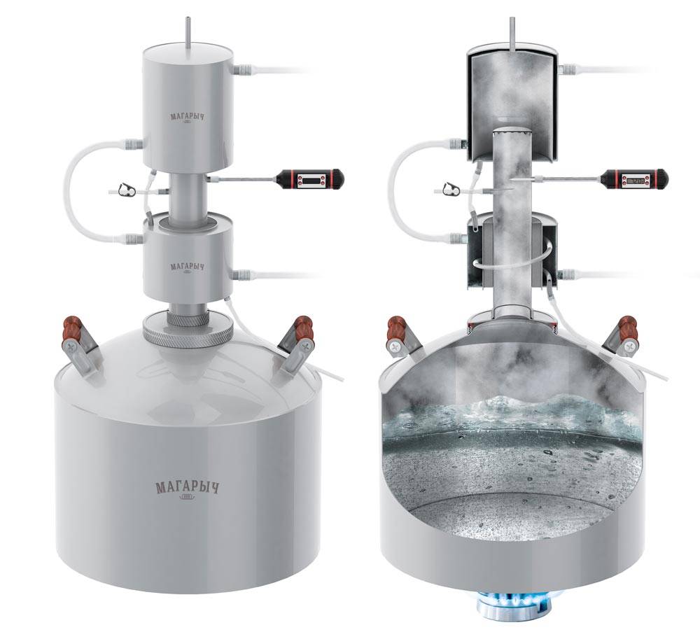 Аппарат представляет из себя конструктор из двух царг и двух холодильников, которые можно комбинировать между собой. Перегонку браги в спирт-сырец обычно совершают в режиме потстилл, а вот уже во время второго погона задействуют универсальный узел отбора.