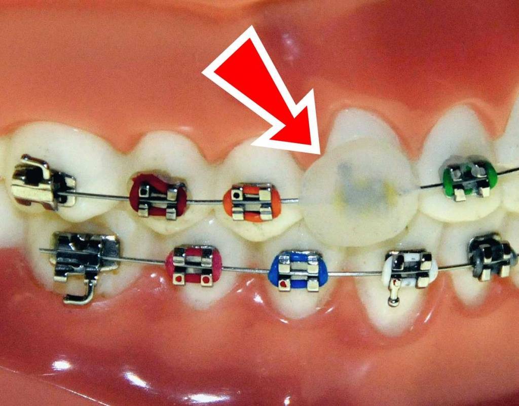 - Тщательно обрабатывают каждый замок брекета и места его соединения с зубной эмалью.