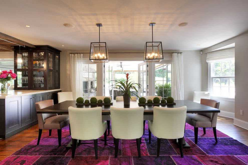 - Желательно, чтобы по форме он совпадал с формой стола. Это зрительно более четко отделит обеденную зону и лучше визуально соединит мебель и ковер в один участок пространства.