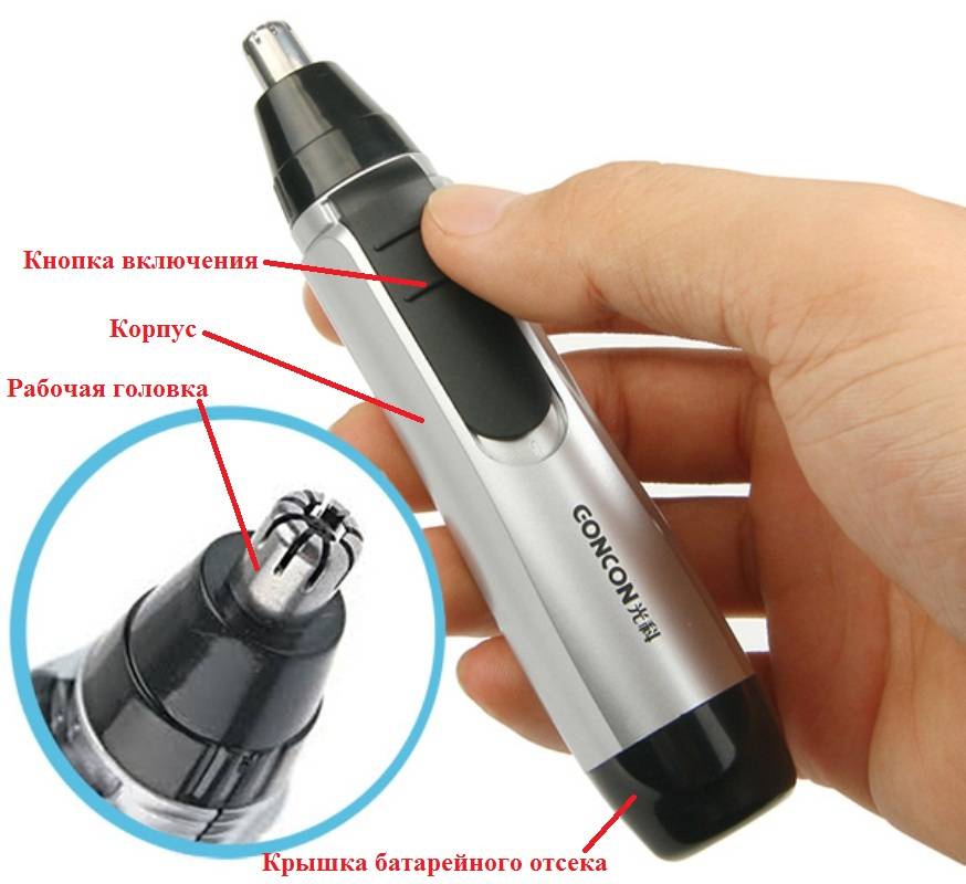 Машинка для состригания волос в носу имеет очень простую конструкцию, состоящую из следующих деталей и узлов:
