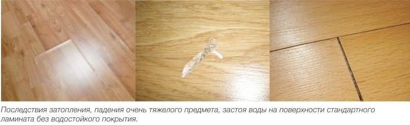 Здесь важно отличать понятия влагостойкость и водостойкость. Влагостойкий ламинат может выдержать лишь влажный воздух, а вот прямой контакт (даже кратковременный) с водой приведет к его разбуханию