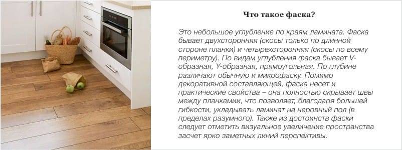 Другой довод в пользу выбора покрытия без фасок – попадание в бороздки воды. С поверхности без фасок влагу можно быстро удалить, а в случае с углублениями сложно идеально насухо вытереть покрытие. Постепенно внутри фасок начнут формироваться деструктивные процессы.