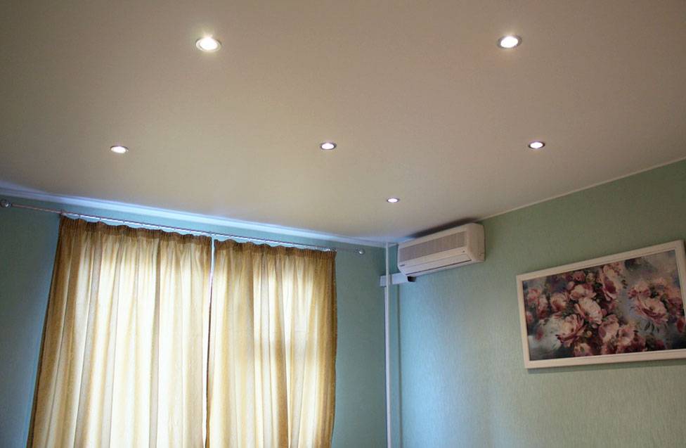 Для матовых ПВХ потолков можно использовать те же источники света, что и для тканевых, но мощность ламп накаливания не должна превышать 35 Вт, а лучше всего использовать светодиодные светильники.