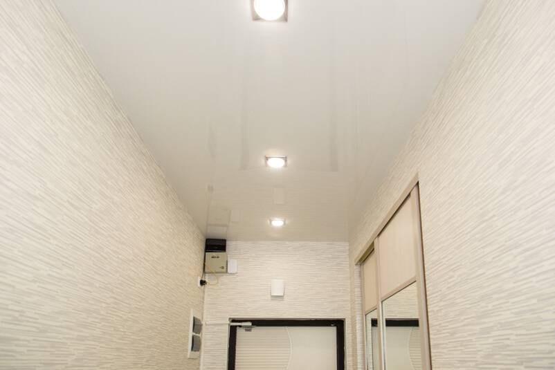 Глянцевый натяжной потолок способен исправить эту проблему. Благодаря отражению света такие полотна делают коридор визуально просторнее.