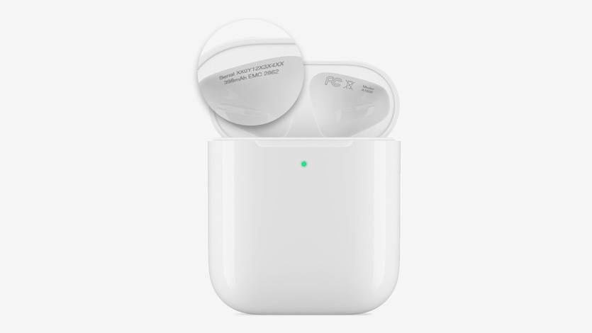 Возле номеров наушников на этой наклейке также указана модель зарядного кейса: вторые AirPods могут быть как с обычным чехлом, так и с тем, который поддерживает беспроводную зарядку.