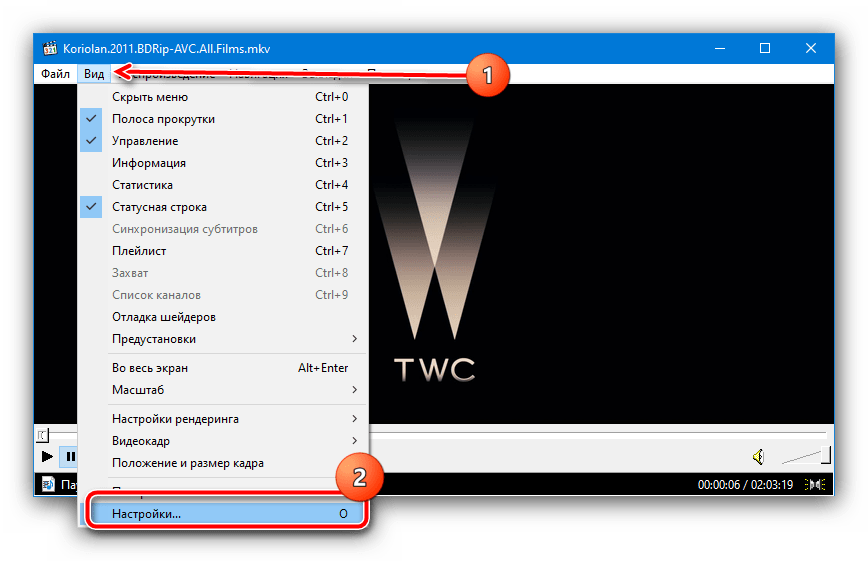 Поставьте воспроизведения на паузу клавишей Пробел, затем воспользуйтесь пунктами «Вид» – «Настройки».