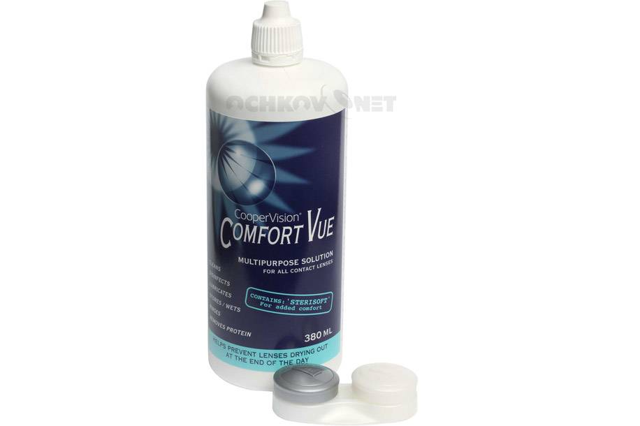 Comfort Vue — многофункциональный раствор от компании Sauflon (Великобритания). При его создании используется компонент стерисофт. Он способствует увлажнению контактной оптики. Это препятствует ее пересыханию и появлению дискомфорта в глазах. Пользоваться Comfort Vue очень удобно, так как не нужно проводить механическую обработку линз. Достаточно оставить офтальмологические изделия в растворе на 4 часа. За это время происходит полная очистка и дезинфекция.