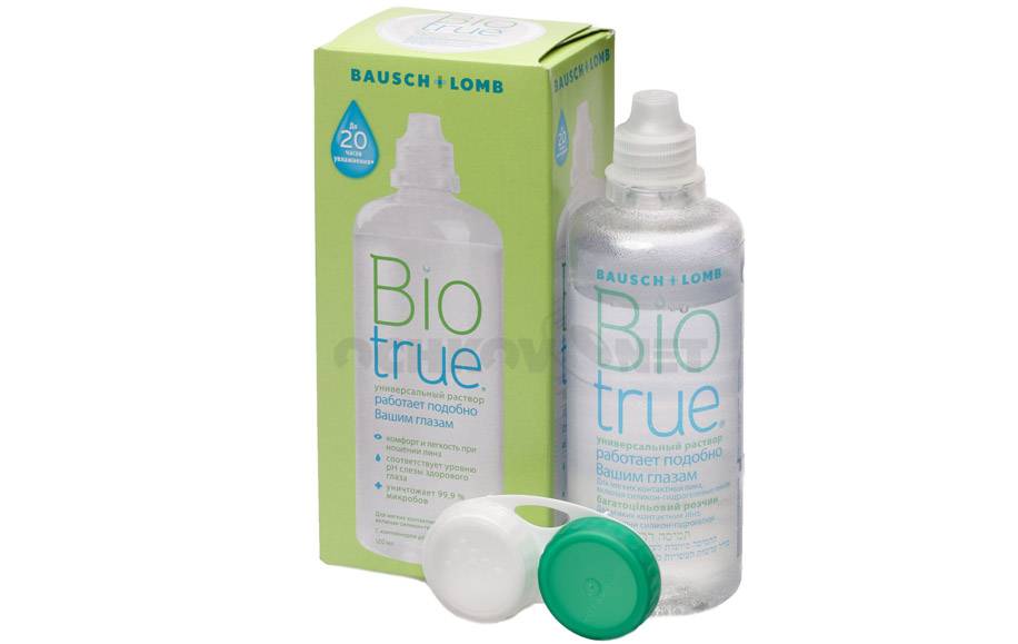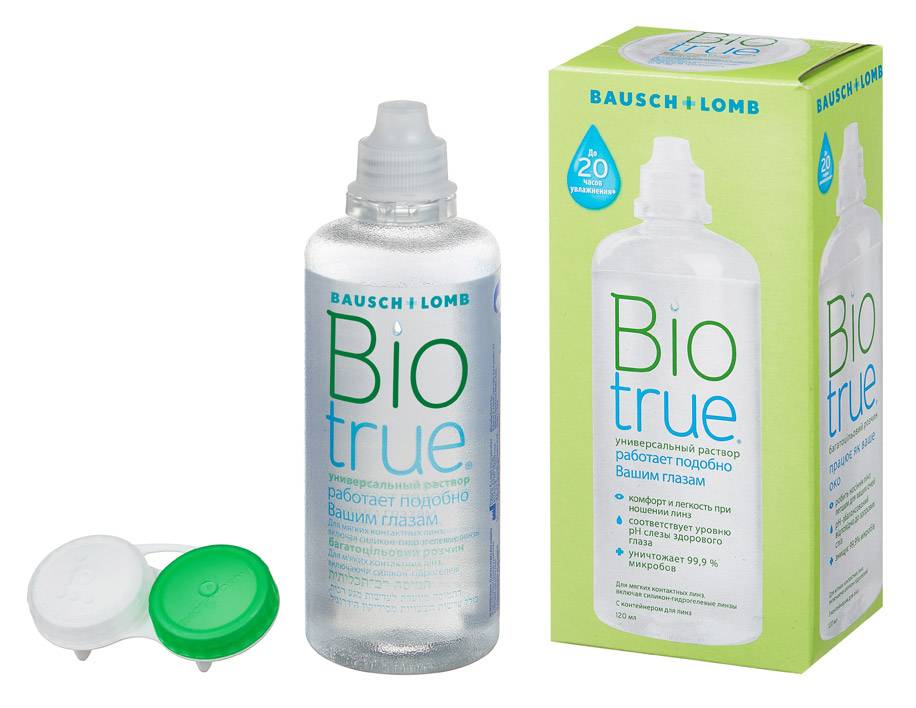 Biotrue — еще один популярный многоцелевой и универсальный раствор от Bausch + Lomb. Водородный показатель очищающей жидкости идентичен pH слезной жидкости человека. Это означает, что она является биосовместимой и подойдет каждому. Кроме того, в составе Biotrue присутствует компонент гиалуронан, благодаря которому линзы не пересыхают и становятся еще более комфортными.