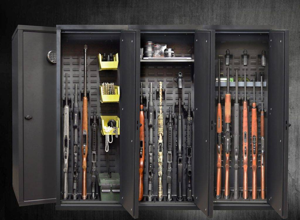 Это самый надежный сейф из всех известных. Его цельносварной корпус имеет усиленную основу, сверху оснащенную стальными бронепластинами толщиной 4,76 мм, что надежно защищает оружейный шкаф от выстрелов. Изнутри шкаф имеет мягкую отделку и осушитель, при открытии автоматически включается светодиодная подсветка.