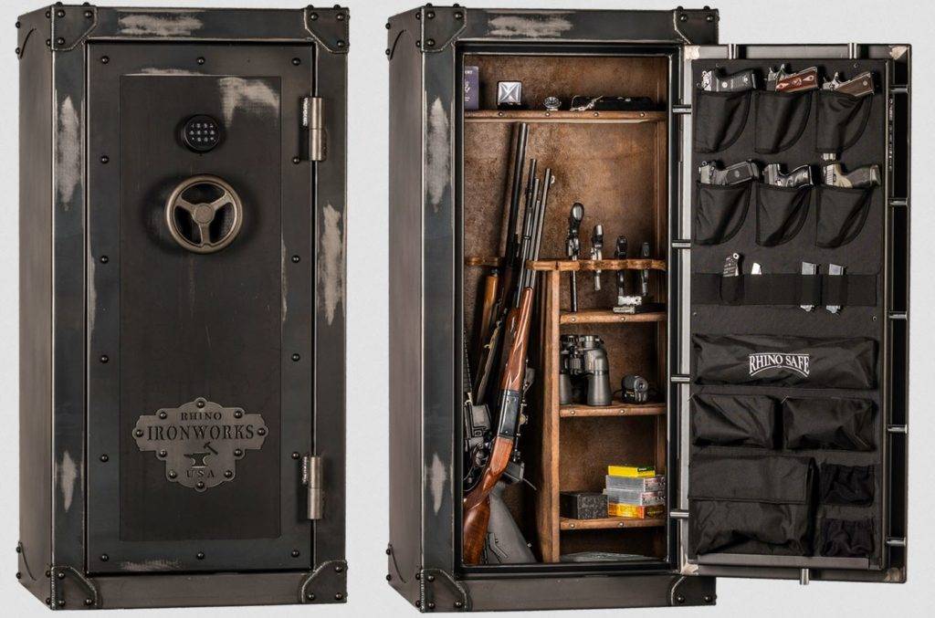 Хранилище от американского производителя Rhino Ironworks имеет оригинальный дизайн под старину, позволяющий вписываться в любой интерьер помещения. Огнестойкость и взломостойкость изделия подтверждается американскими сертификатами соответствия. Запорное устройство оснащено электроникой, замок закрыт бронированной пластиной из карбида вольфрама. При неправомерном воздействии на замок, он автоматически блокируется. Шкаф рассчитан на хранение 28 стволов массивного оружия. Корпус снаружи усилен приварными накладками, внутри отделан мягкой экозамшей, имеющей вид потертой кожи. При открытии приспособления внутри автоматически включается светодиодная подсветка. Вес 441 кг.