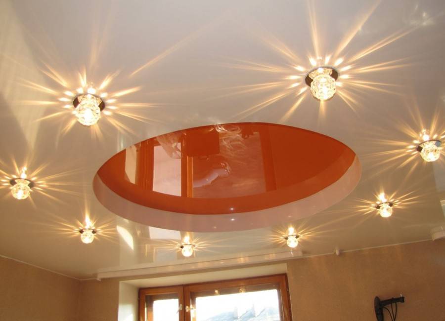 С натяжными потолками отдельная история – там все отверстия их диаметр и расположение закладываются на этапе проектирования потолка. Устанавливаются термокольца, препятствующие перегреву пленки потолка от нагрева лампы. Термокольца также обеспечивают механическую прочность места установки светильника, об этом я писал на Сам Электрике в статье Установка люстры на натяжной потолок. Нужно сразу учесть мощность ламп, которые будут устанавливаться, их количество, “скученность”.