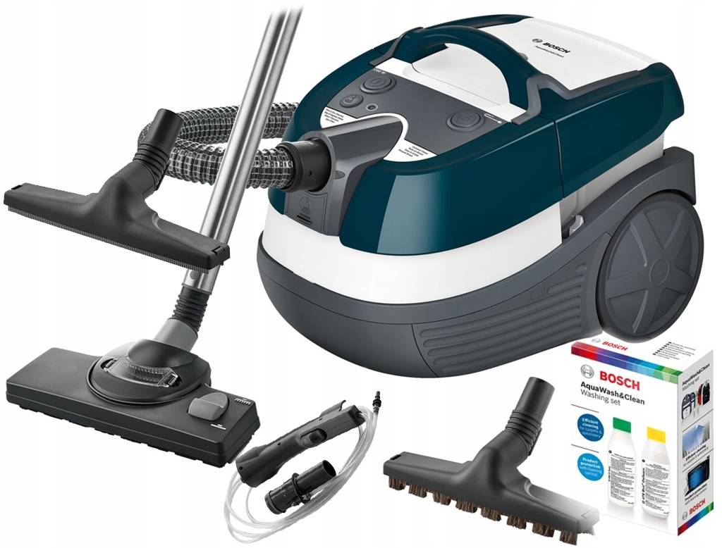 В рейтинг лучших моющих пылесосов попал еще один известный бренд из Германии. Бело-серый пылесос Bosch BWD 41720 разрабатывался для максимально деликатной и несложной уборки любого типа: