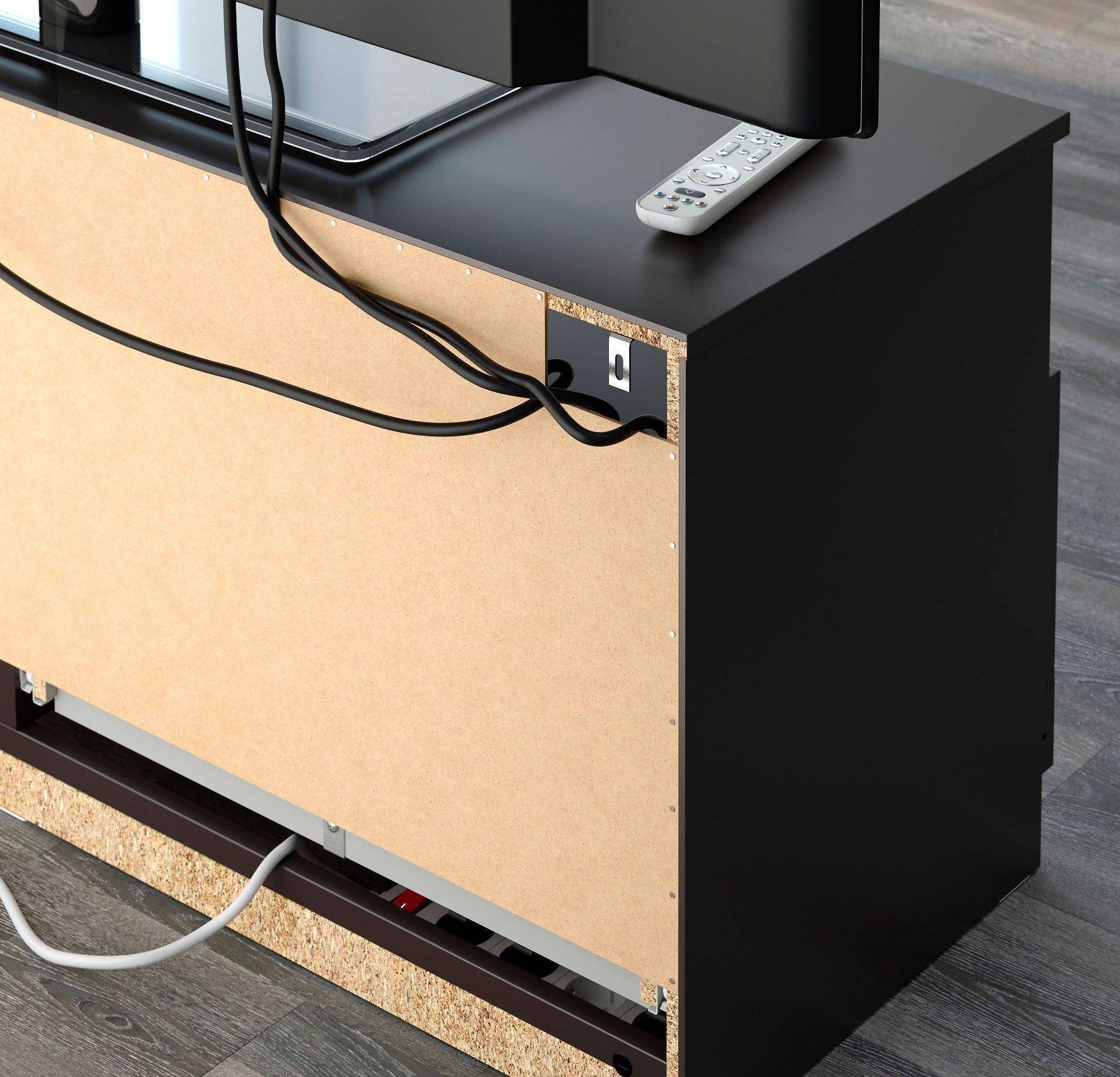 ![]() | Отверстие в задней стенке | Сюда помещаются провода, благодаря чему их можно спрятать и не перепутать. Многие тумбы обладают специальными крышками для отверстий. |