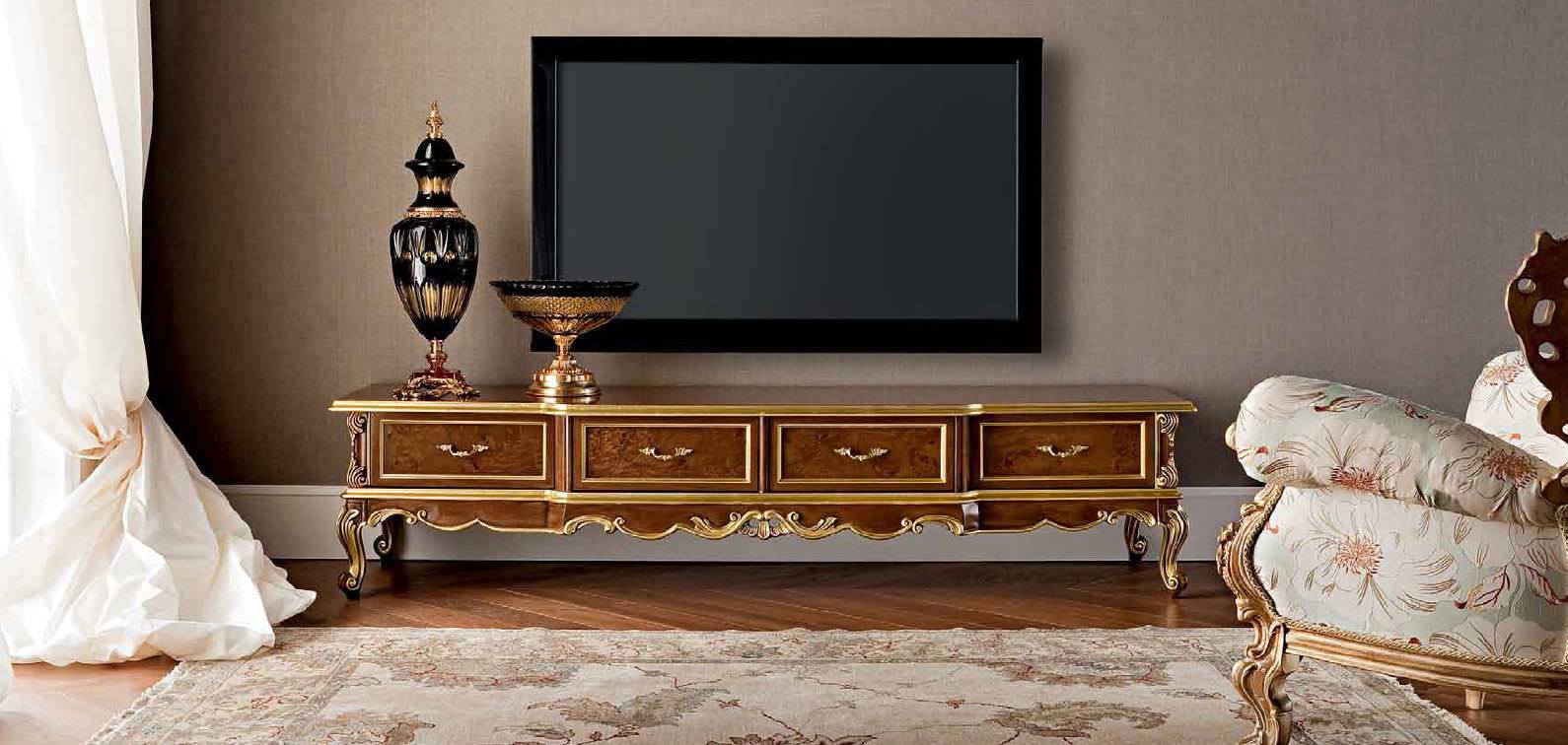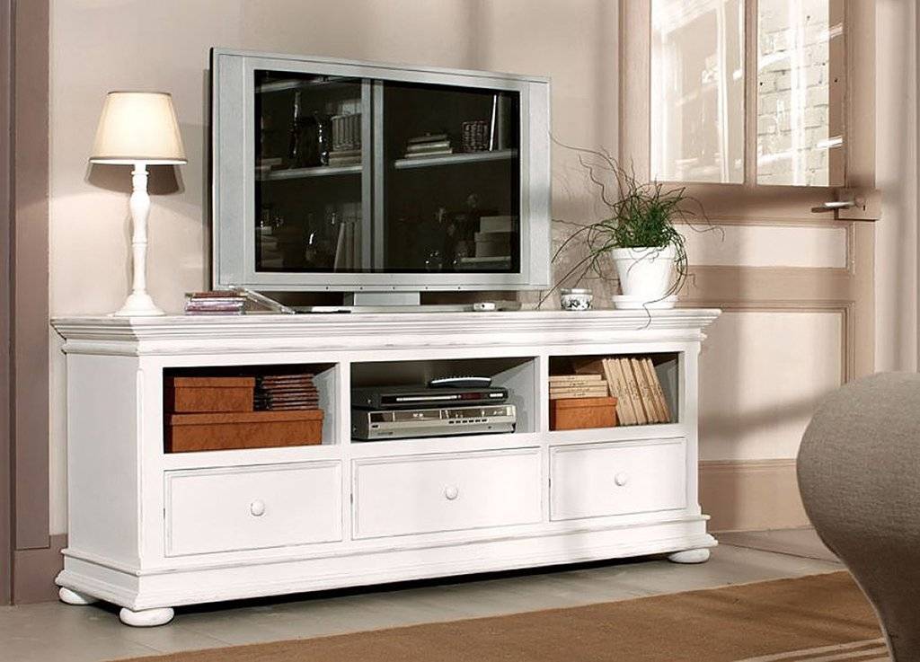 - Прованс. Тумба на первый взгляд выглядит просто: резные ножки, «состаренная» поверхность, сдержанная цветовая гамма. Только приглядевшись, можно оценить весь шарм парижских традиций, которым «пропитана» мебель под телевизор в стиле прованс.