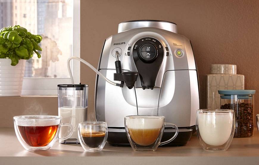 - эспрессо-комбайны: они имеют встроенную кофемолку, устройство для вспенивания молока и могут приготовить кофе-эспрессо, есть система, регулирующая крепость кофе и его объем;