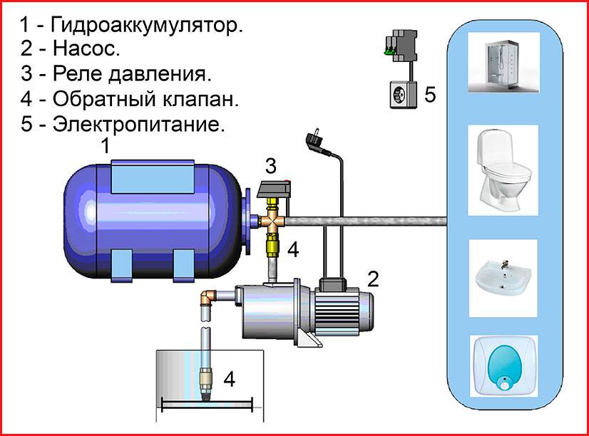 Гораздо более актуальными сейчас являются насосные станции с применением гидроаккумулятора. Суть их работы заключается в том, что в системе присутствует реле давления, суть которого заключается в осуществлении контроля давления окружающего воздуха.