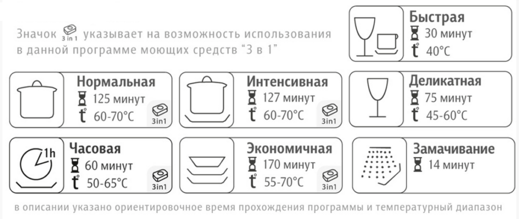 - Стандартный цикл подходит для большинства видов посуды и проходит примерно за 1,5 часа. Он включает предварительное замачивание, основной процесс мытья и ополаскивание;