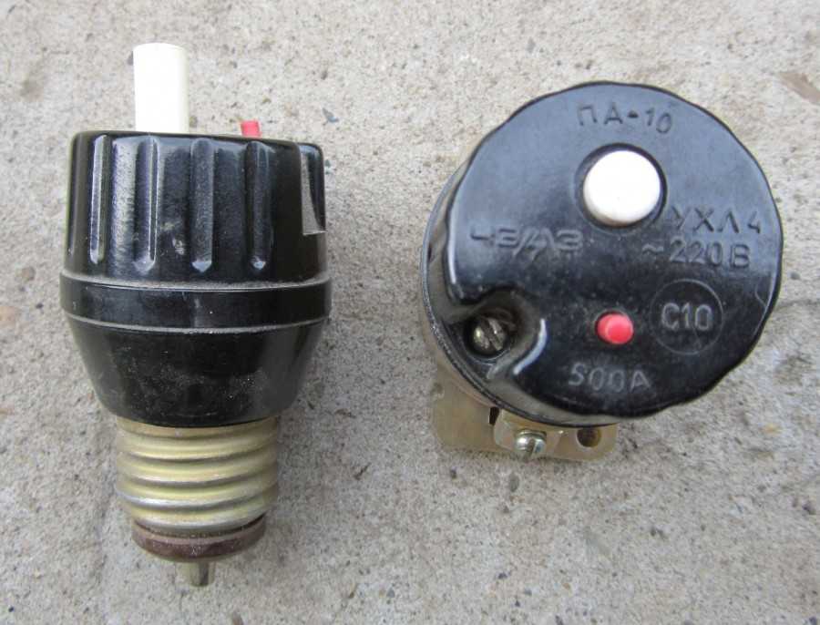 - Автоматические пробки включаются нажатием кнопки белого цвета. Расположена она в верхней части пробки. Красная кнопка — отключение питания.