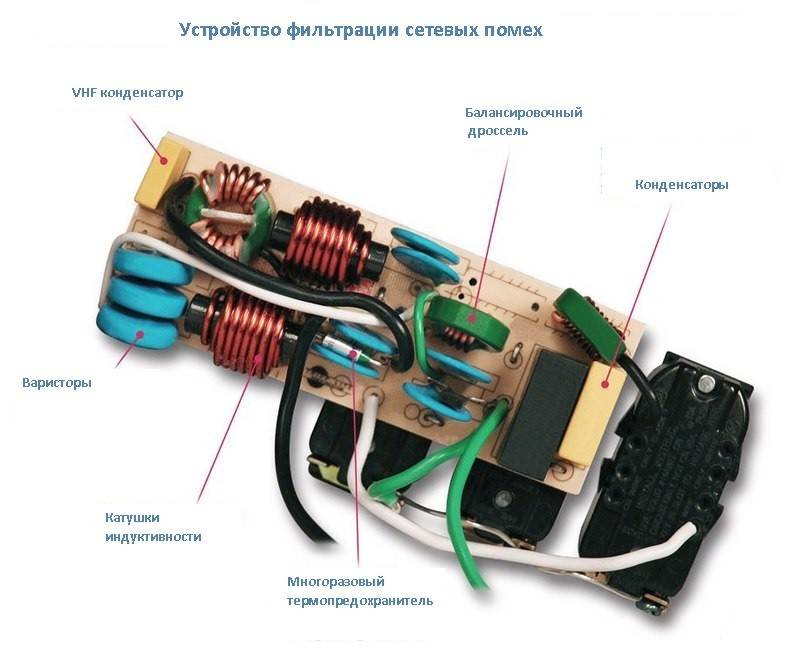 В нормальных условиях основную работу в сетевом фильтре выполняют катушки индуктивности и конденсаторы, которые гасят гармонические помехи, характерные для бытовой электросети.