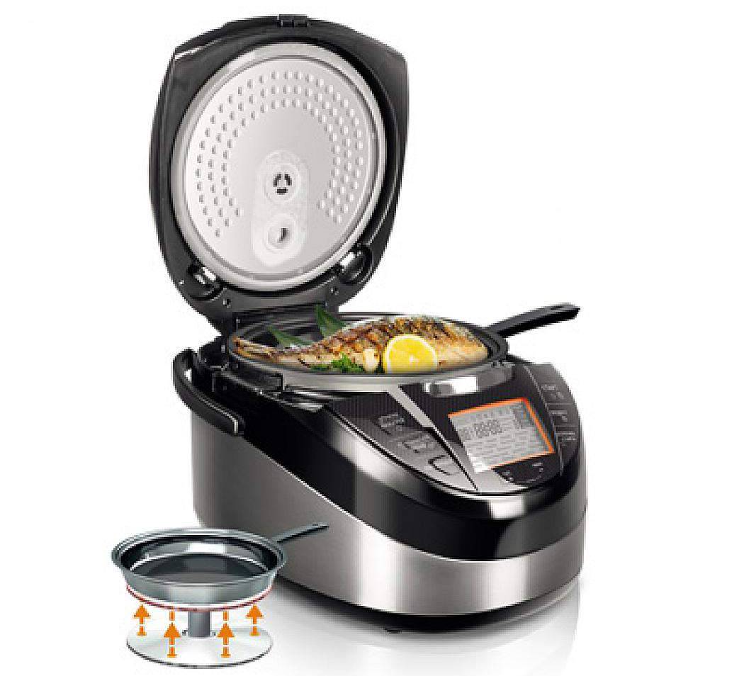 Дорогая и мощная индукционная мультиварка поддерживает двухконтурную систему нагрева — в стенках и крышке устройства дополнительно предусмотрены классические ТЭНы. Обеспечивает очень быстрое и качественное приготовление блюд, есть голосовой помощник. Агрегат отличается повышенной долговечностью и удобством применения.