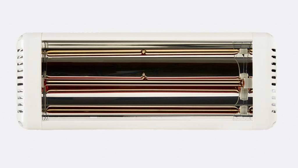 Этот галогенный обогреватель выделяется своим дизайном. Ребристая решетка, в отличие от тонких прутиков у моделей конкурентов, смотрится мощно и оригинально. По виду фронтальная панель, своим свечением, напоминает жар, исходящей от камина с дровами. Агрегат наделен мощностью 1000 Вт и функционирует в одном режиме. Габариты 50х17х7 см легко разместить на потолке, без необходимости переставлять плафоны освещения. Весит ламповый обогреватель 2 кг. Работает всегда в одном режиме на полную силу и без термостата. В конструкции производитель использован новое решение — выпуклое стекло. За счет этого пропуск инфракрасного излучения возрастает на 10% по сравнению с плоским экраном.
