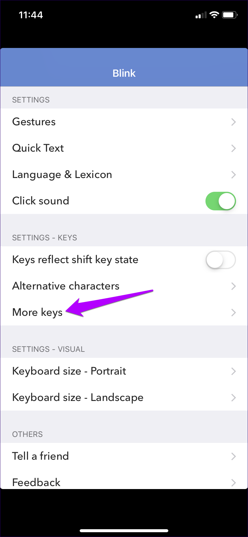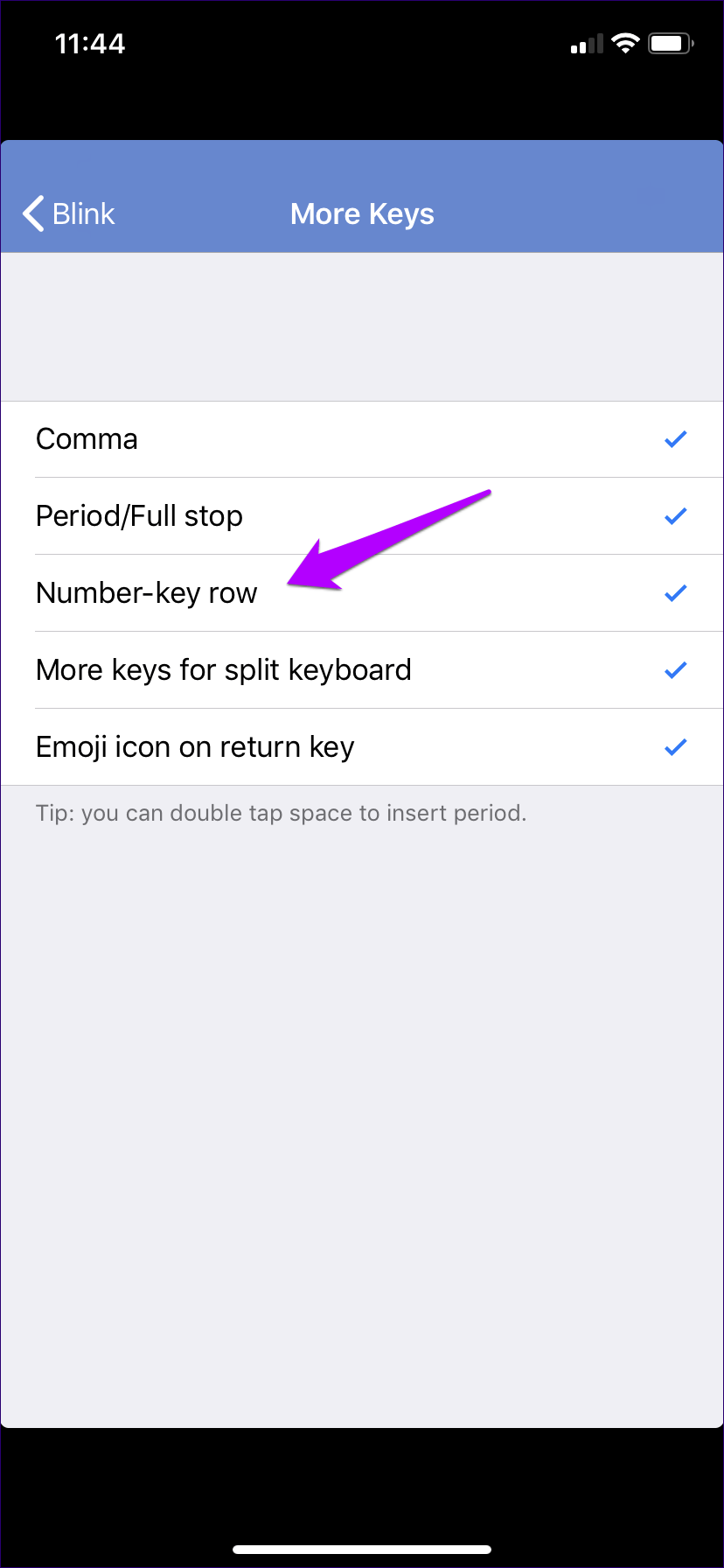 Чтобы включить отдельную строку номеров, просто откройте приложение Blink, нажмите «Другие ключи», а затем нажмите «Строка с цифровой клавишей».