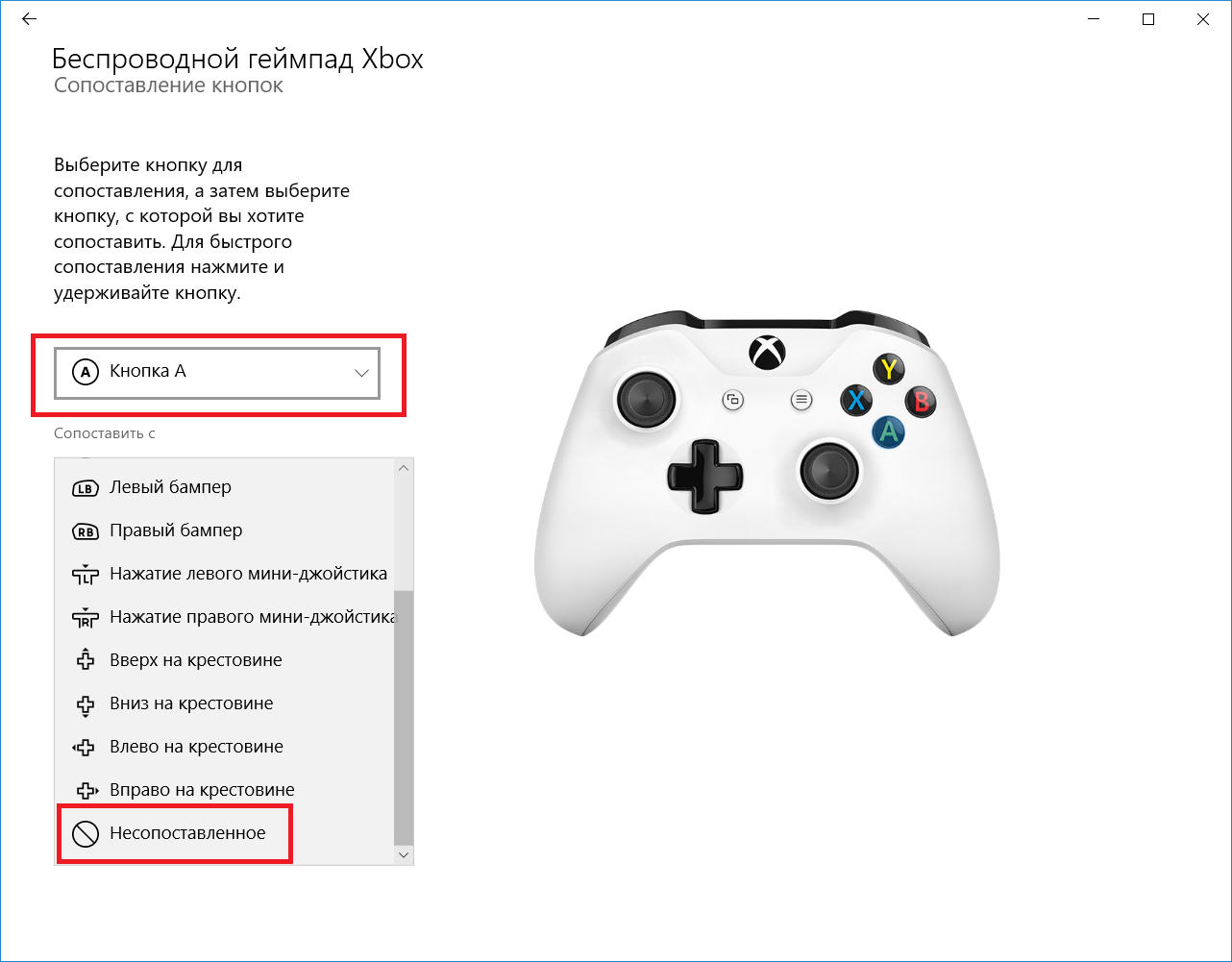 Из первого выпадающего меню выберите кнопку, которую хотите отключить. Это может быть одна или несколько XYAB, бамперы, крестовина или кнопки на стиках. Затем из второго выпадающего меню выберите пункт Несопоставленное