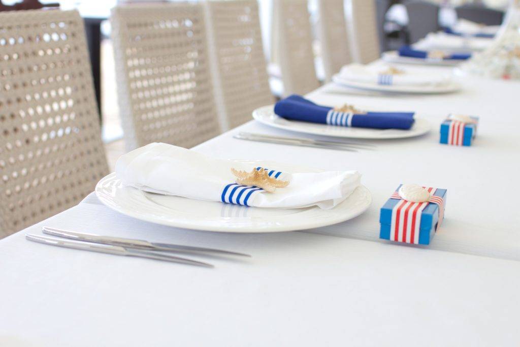 Перед торжественным мероприятием и приходом гостей мы хотим, как можно красивее украсить праздничный стол. В центр стола можно поместить праздничную композицию, а сервировать при помощи красивой посуды и салфеток.