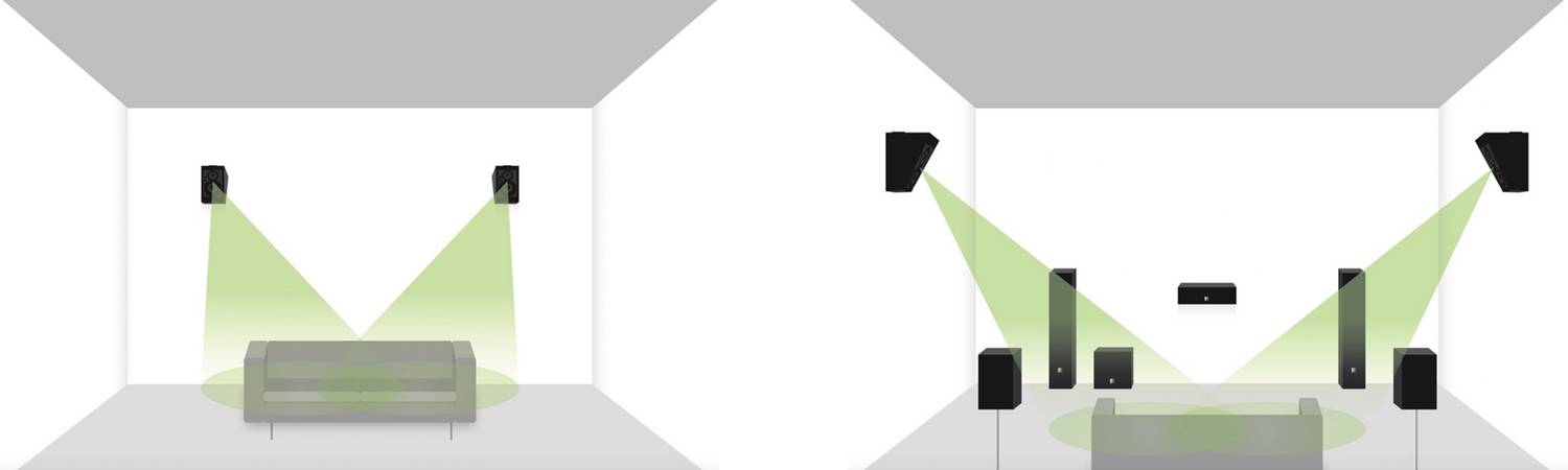 Если все эти системы будут одинаково стоять на полу или висеть на потолке, общий звук будет идентичным, звуковое поле – слитным, равномерным. Казалось бы, так просто… Но не используется почти никогда. Владельцы кинотеатров очень часто являются меломанами и слушают музыку, записанную двухканальным стереоформатом.