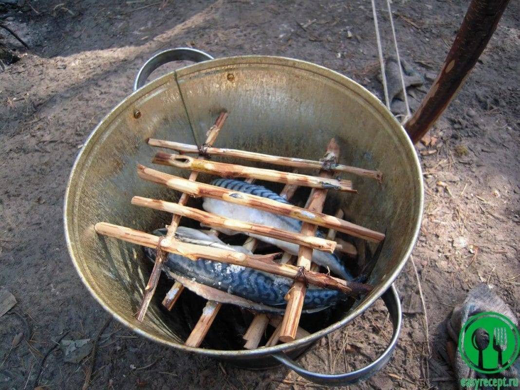 Фото 1. Процесс приготовления рыбы на коптильне, изготовленной своими руками. Продукты выкладываются на специальную решётку.