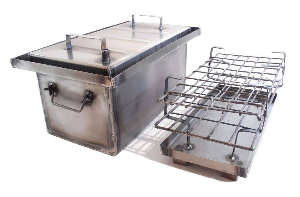 Алюминиевая посуда. Такая посудина достаточно легкая. Оно очень хорошо моется. Но стоит помнить о том, что если температура будет превышать 400 градусов, то материал быстро становится хрупким. В связи с этим стоит следить, чтобы огонь постоянно был небольшой. Нельзя оставлять конструкцию для копчения из алюминия без присмотра на долгое время.
