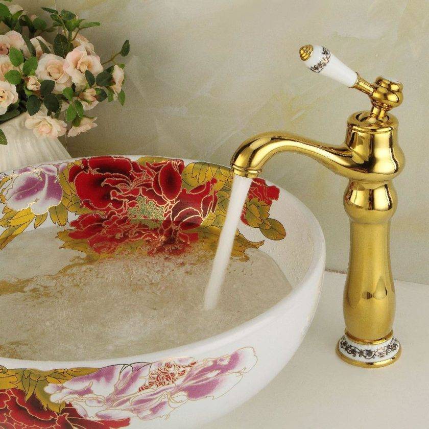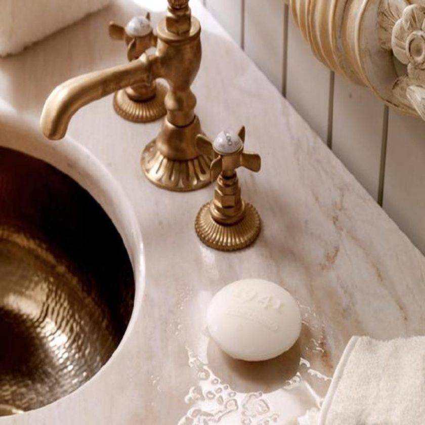 Если ванная сделана в старинном стиле, то дополнительные элементы лучше всего выбирать с эффектом состаренного золота. Как это будет смотреться хорошо видно на фото золотой ванной комнаты.